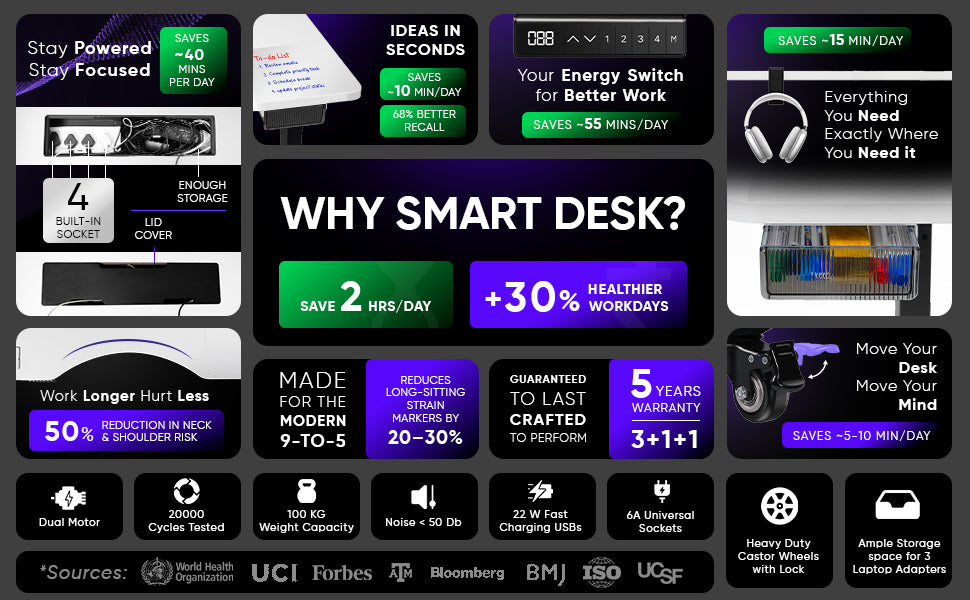 A: Desko Smart Desks stand out with their innovative features like dual-motor mechanisms for smooth height adjustments, integrated accessories such as cable organizers and wireless chargers, and a premium build quality that ensures stability and durability. Designed for both functionality and aesthetics, these desks cater to modern professionals who seek a blend of performance and style in their workspaces.